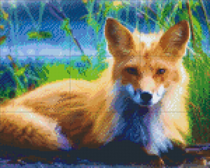 Cette superbe mosaïque en pixels capture l'instant de repos d'un renard roux dans un décor de nature luxuriante. Les couleurs sont éclatantes et contrastées : le bleu profond et le vert intense de l'arrière-plan mettent magnifiquement en valeur la fourrure orange et blanche du renard. Son regard vif et sa posture détendue confèrent à l'œuvre une élégance sauvage et paisible.