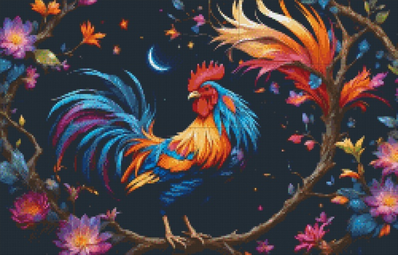 Ce pixelhobby est une explosion de couleurs vives sur un fond bleu nuit profond. Il représente un coq majestueux, symbole de fierté, dont le plumage flamboyant mélange des teintes de bleu électrique, d'orange ardent et de rouge intense. Cette composition crée une atmosphère à la fois mystique et dynamique.