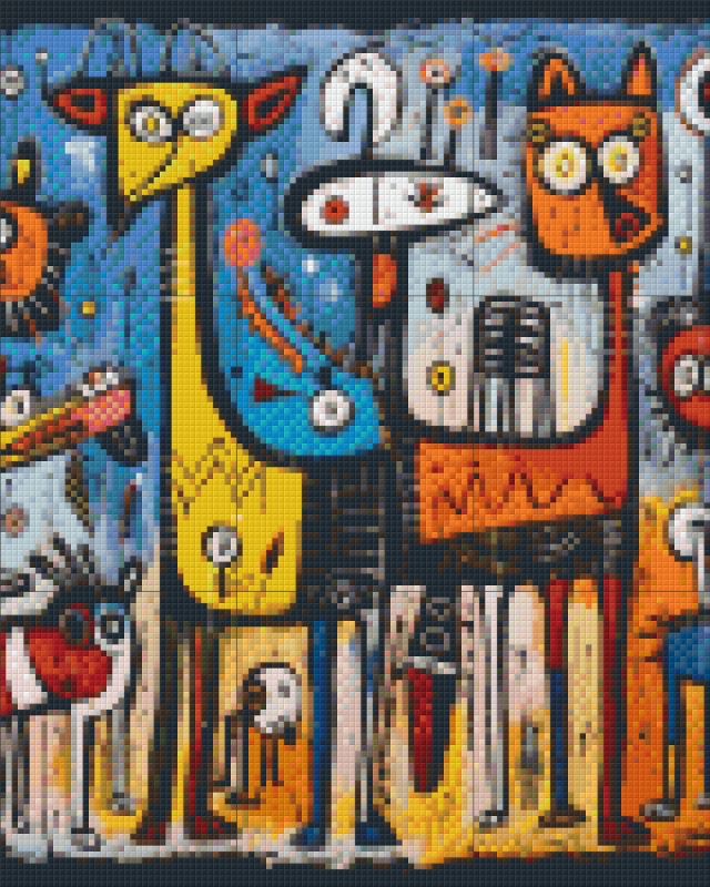 Chaque petit carré de couleur a trouvé sa place pour recréer cette scène chaotique et joyeuse sur un fond bleu azur et orange vif. Le style brut et graphique, avec ses lignes noires épaisses, prend une toute nouvelle dimension avec la précision des pixels. C'est un vrai puzzle d'art moderne !